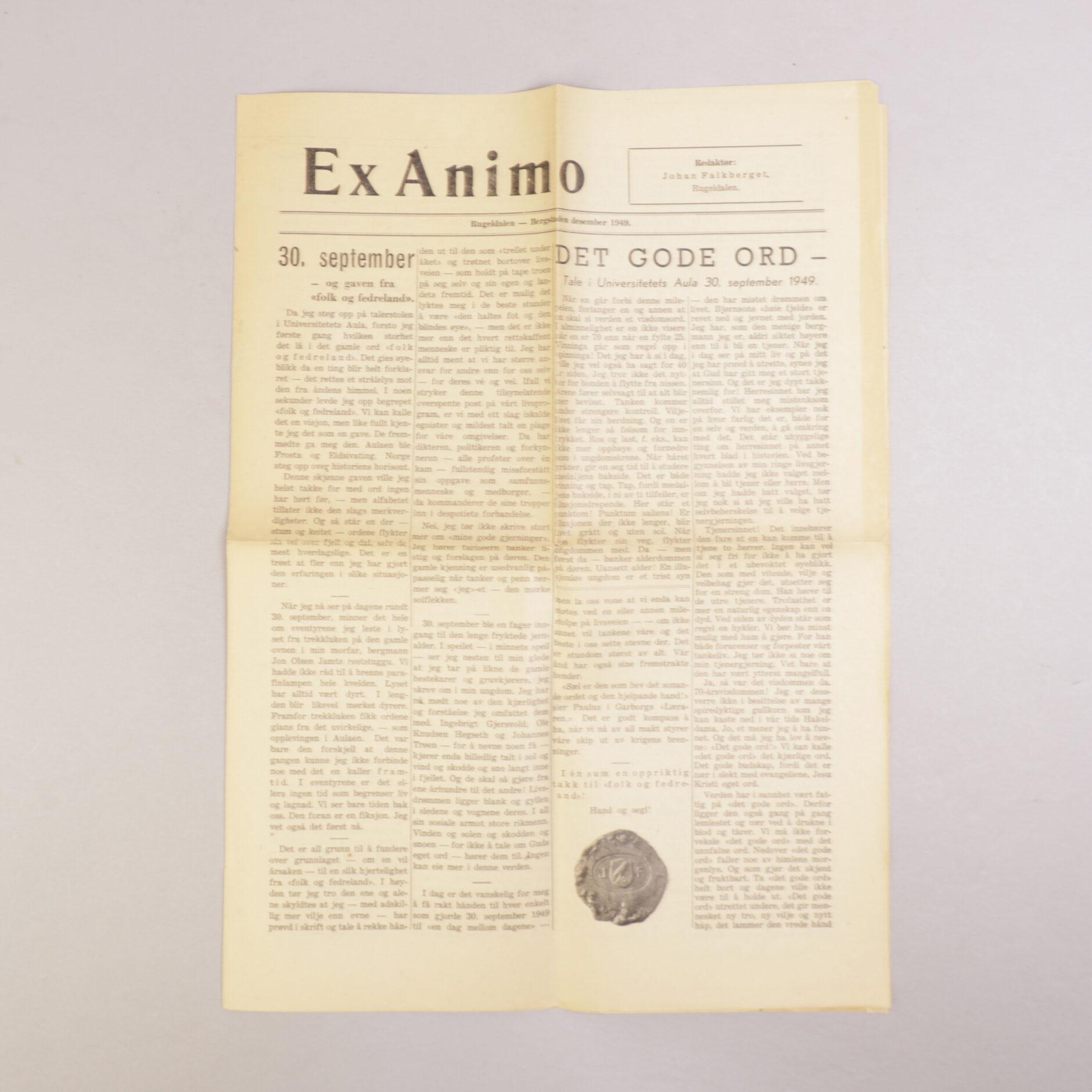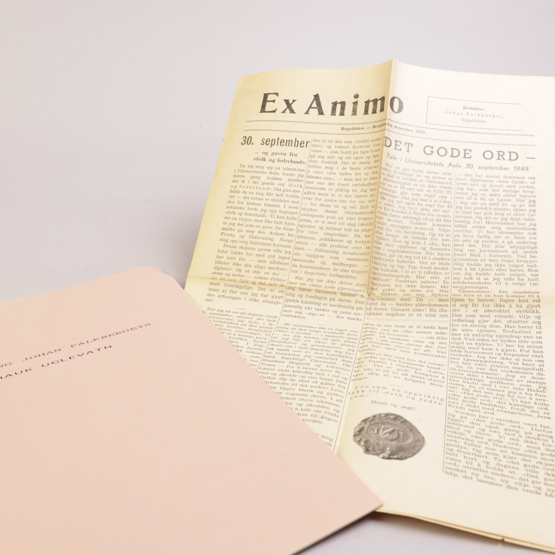 Ex Animo. Mange vil vel syns at Ex Animo er en underlig avis. Jeg skal villig gå med på at den er utenom det vanlige. Det må være meg tilgitt – jeg kan ikke tenke meg annet – at jeg sender den til mine venner. Jeg begynte som journalist og redaktør. Avisen har gått meg i blodet. Det forklarer vel på en måte at jeg denne gangen ikke fant annen forum for det som kom «av hjertet» – enn egen avis. Redaktøren