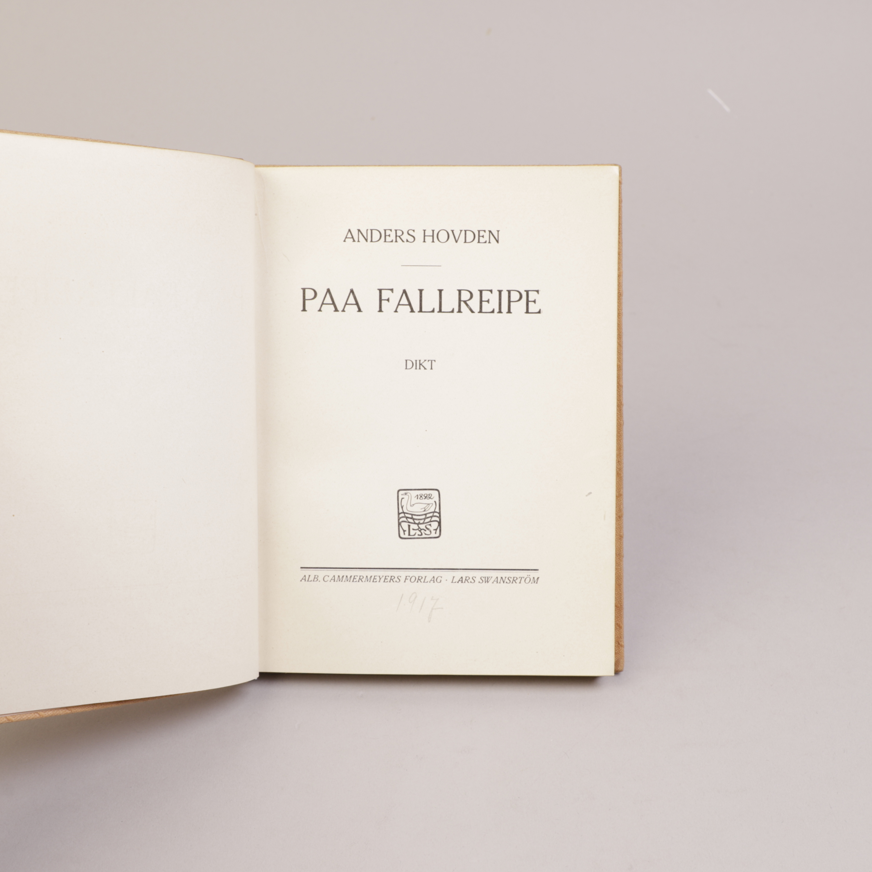 Kristiania: Cammermeyer, 1917. Forlagets myke stoffbind med skinntitteletikett på rygg.