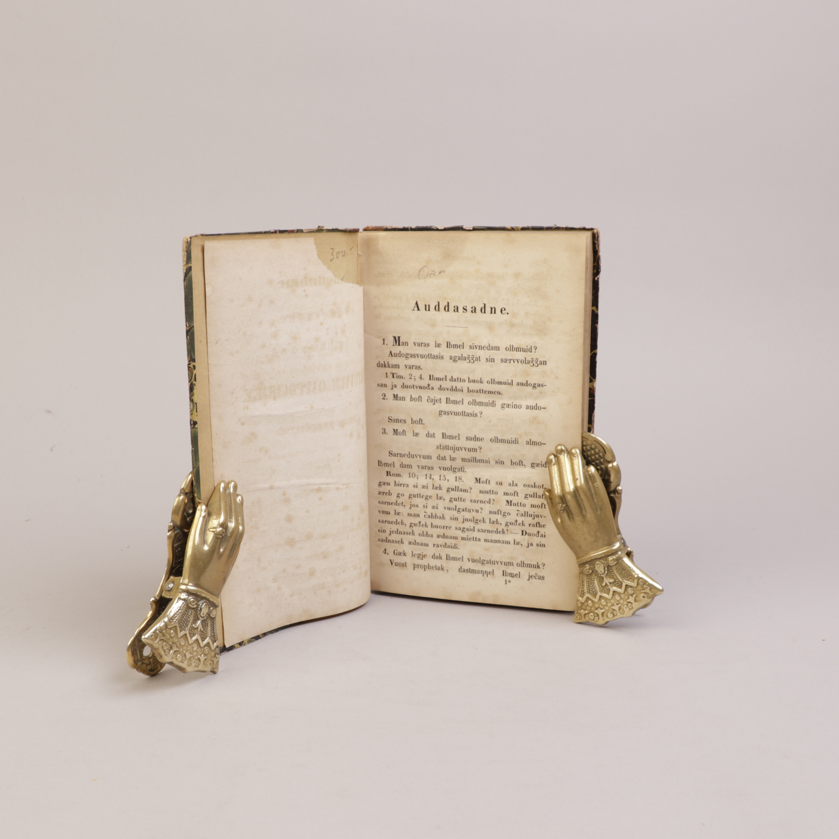 Ryggen med slitasje, dog fast. Avrevet del av tittelblad, i øvre del, mot indre marg.