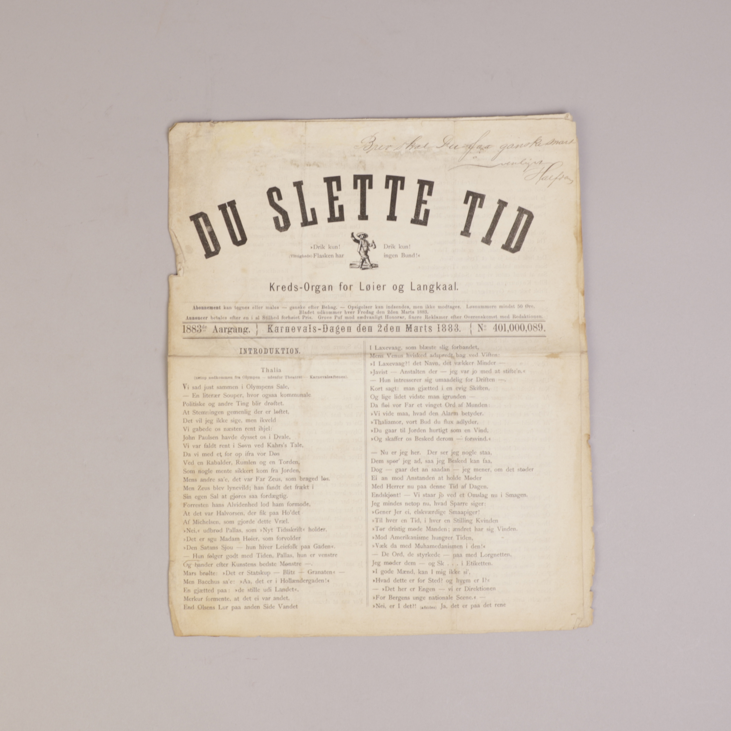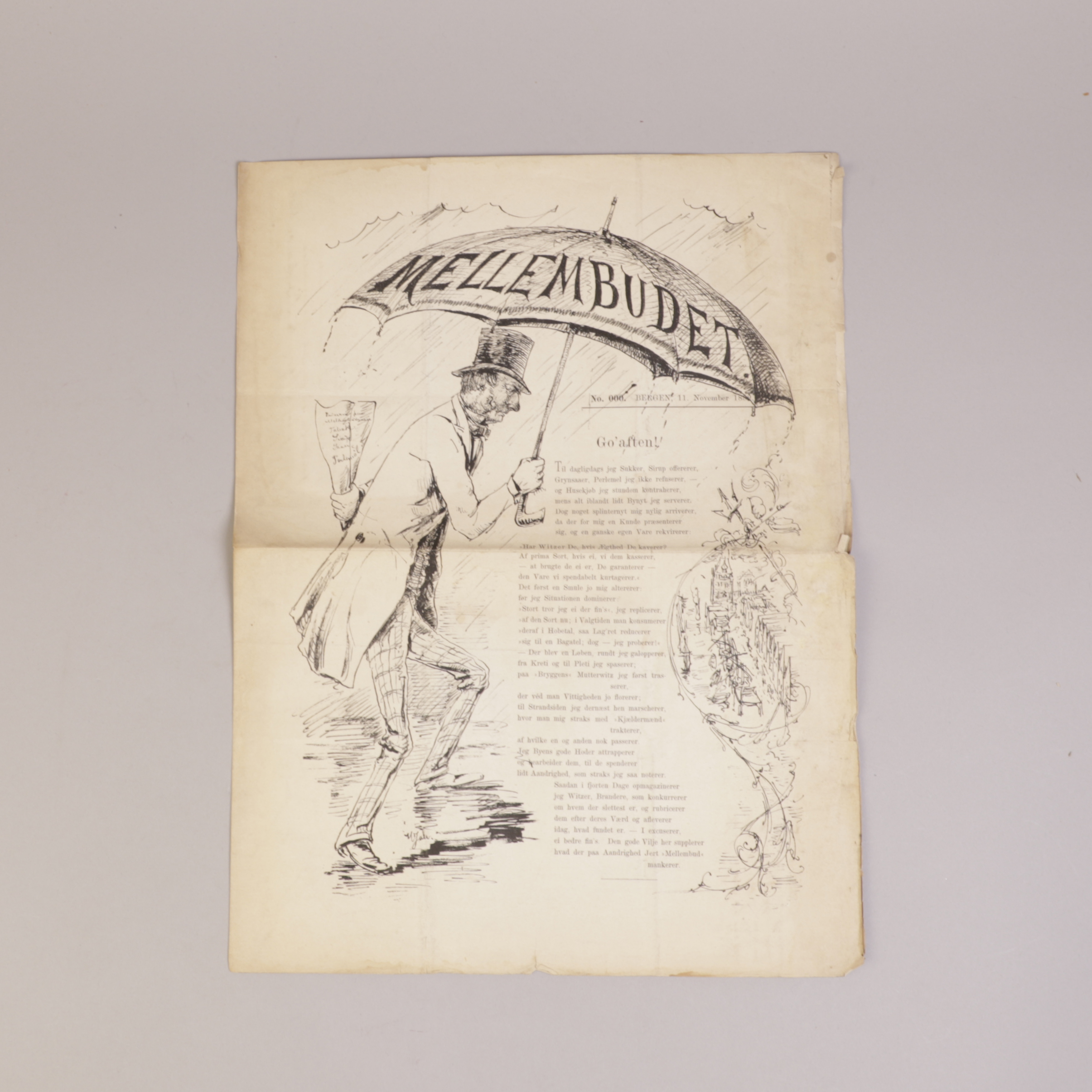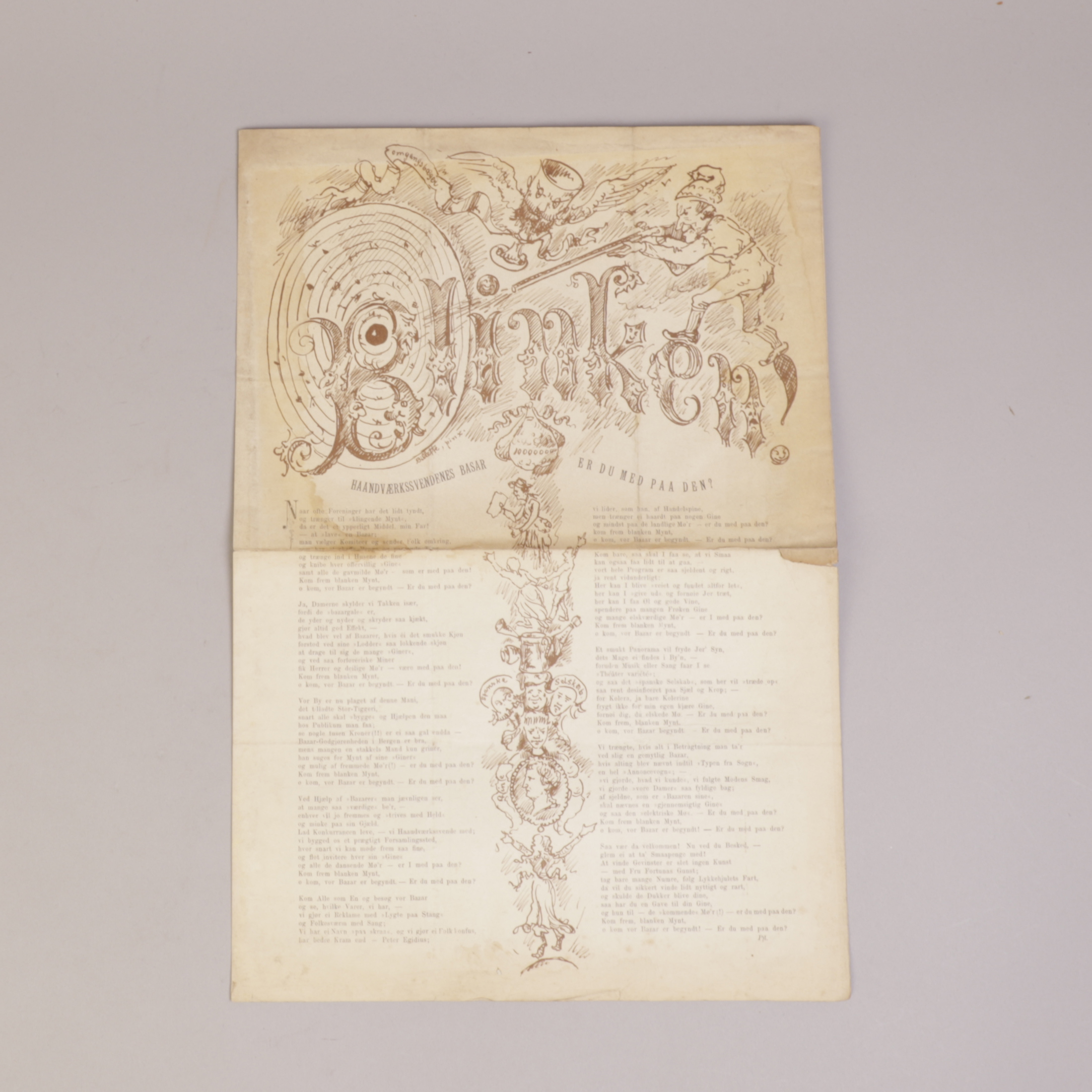 Bergen: 1882. Liten folio. 4 sider. Smusset med bretter og mindre rifter.