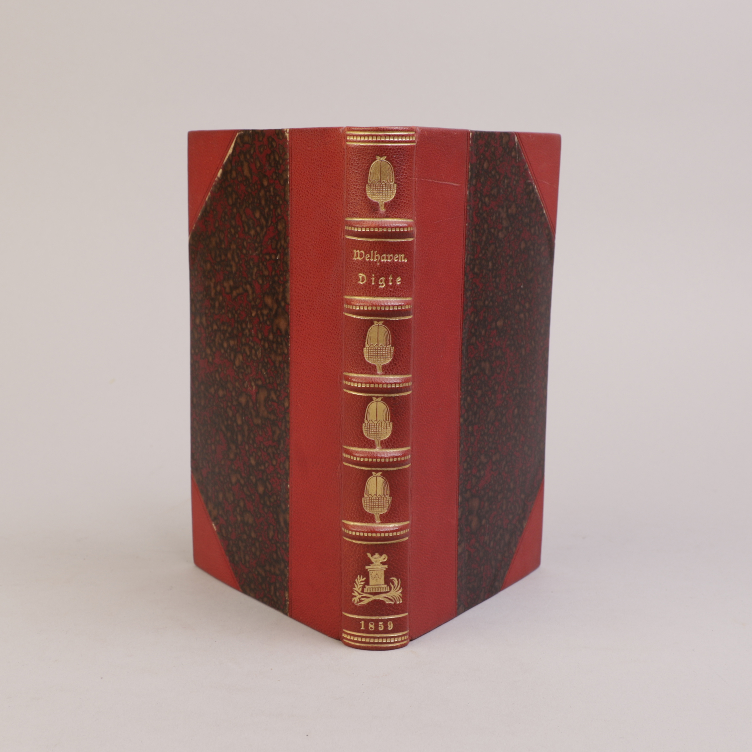 Christiania: Johan Dahl, 1839. 8vo. Rødt halvskinnbind med 5 hevede bind og forgylt dekor med eikenøtter på rygg. Lesebånd i gul silke.