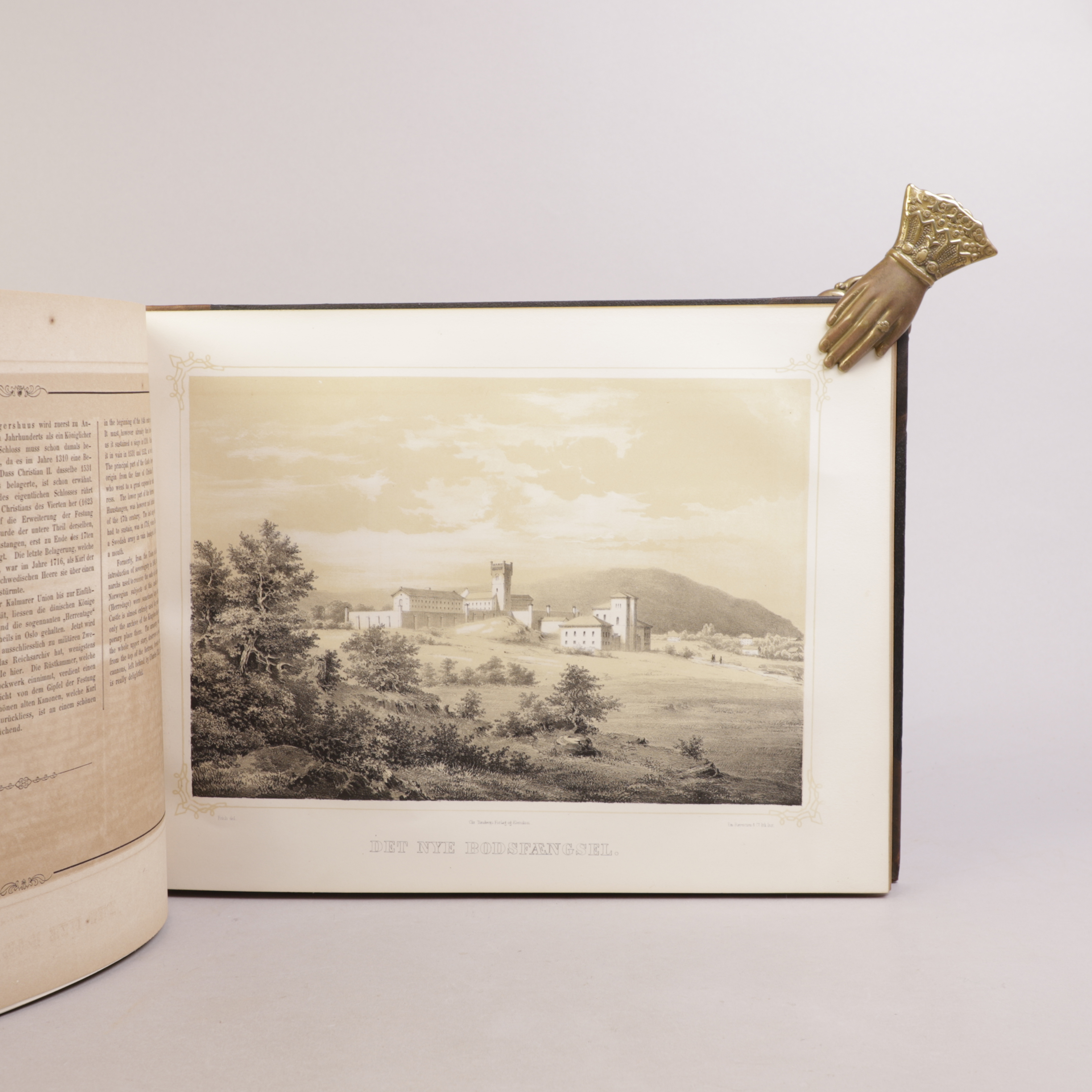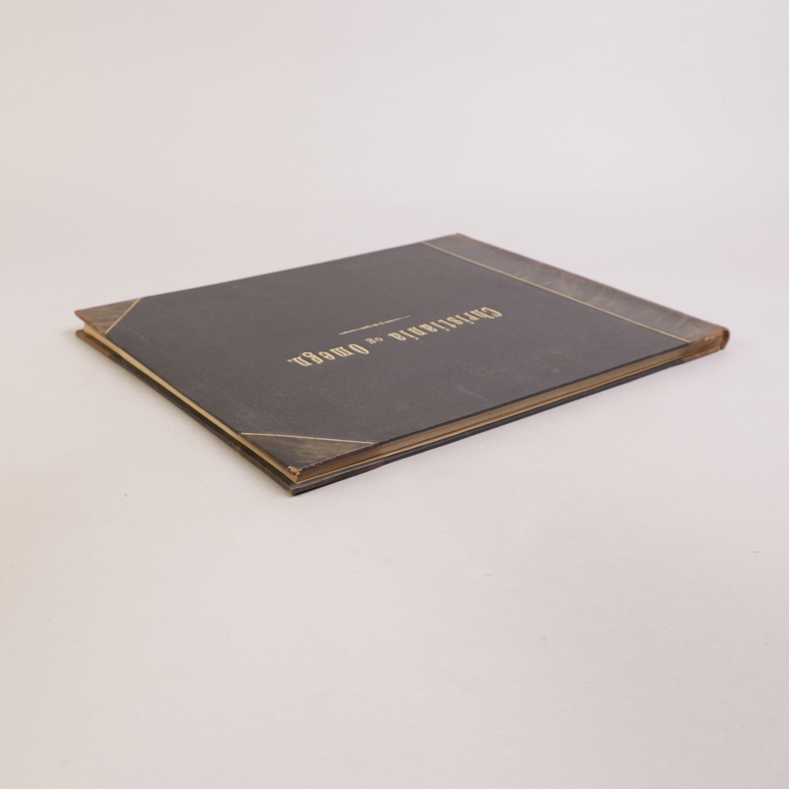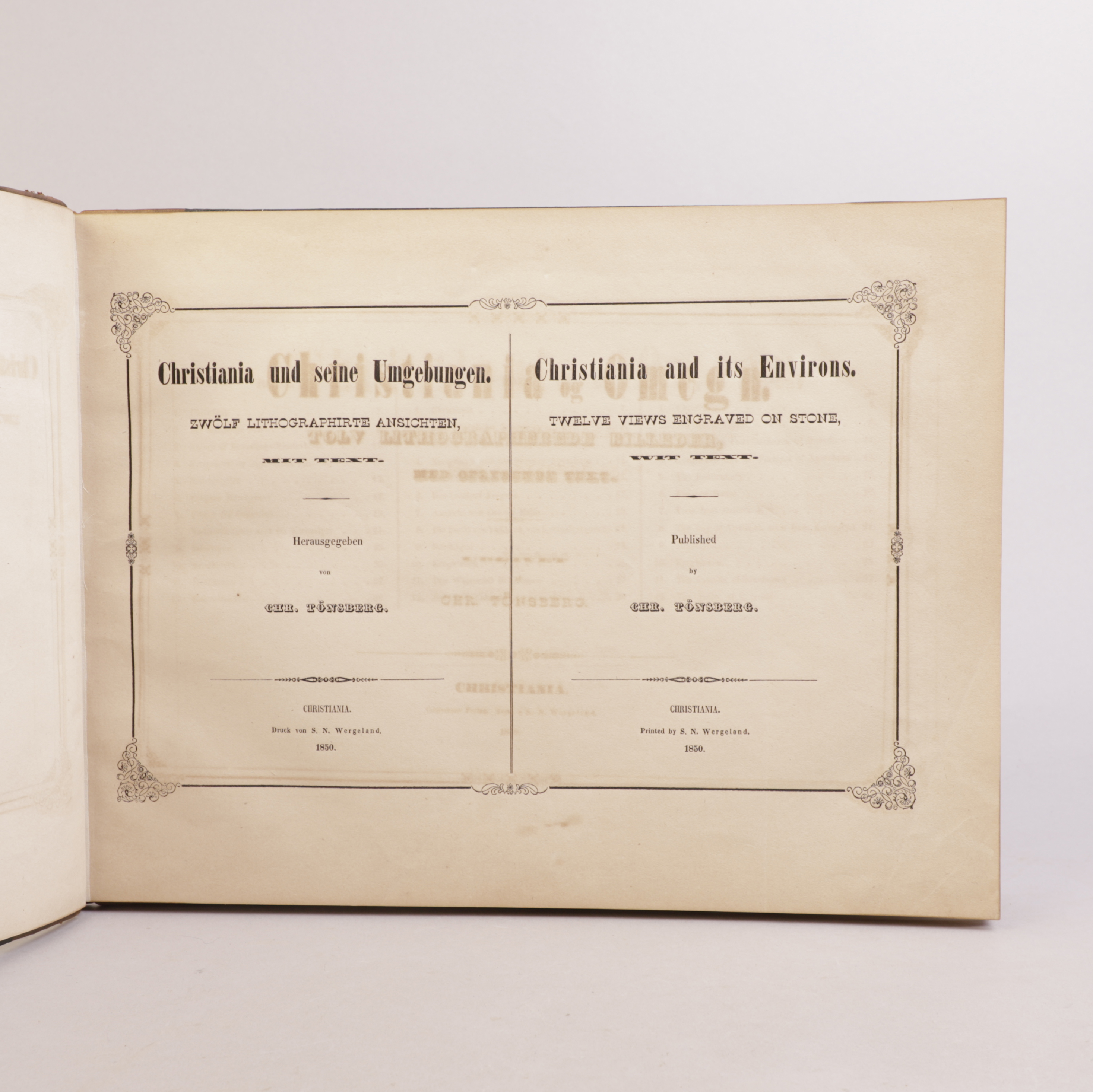 Christiania: Chr. Tønsberg, 1850. Liggende 4to. Komplett. Halvskinnbind med forgylt tekst på fordekkel, bundet med begge omslag.