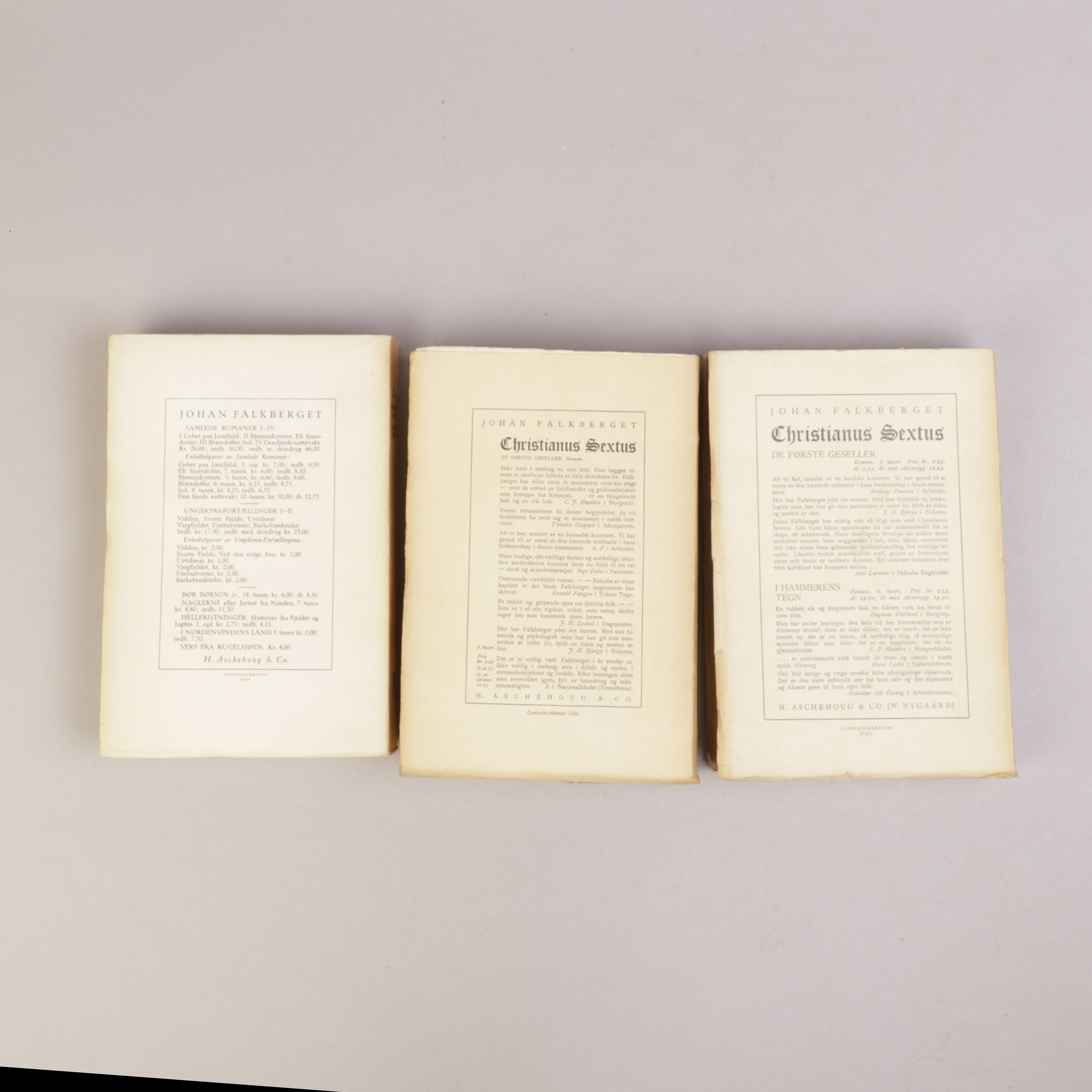Bøkene har noe mørknede rygger, for øvrig fremstår de som meget velholdte. Alle usprettet.