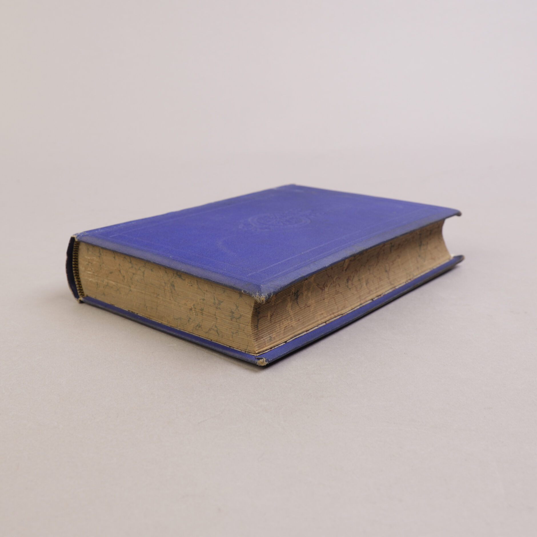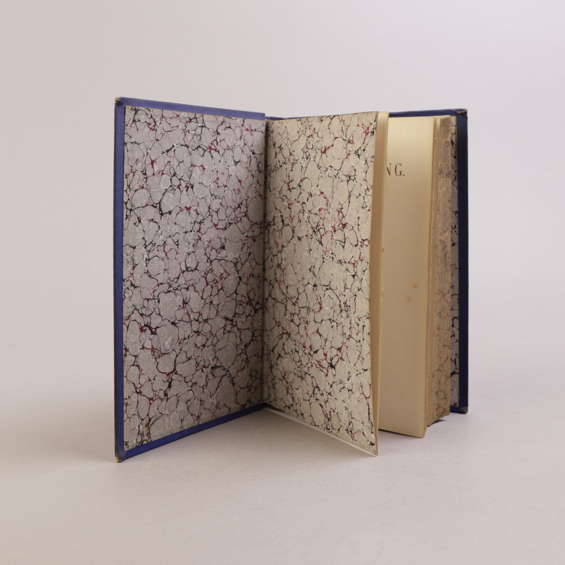 Rygg noe mørknet, dekler med meget svake pletter i nedre kant. Navnetrekk på firblad. Et fåtall pletter i materien. For øvrig et fast og godt eksemplar med intakte falser.