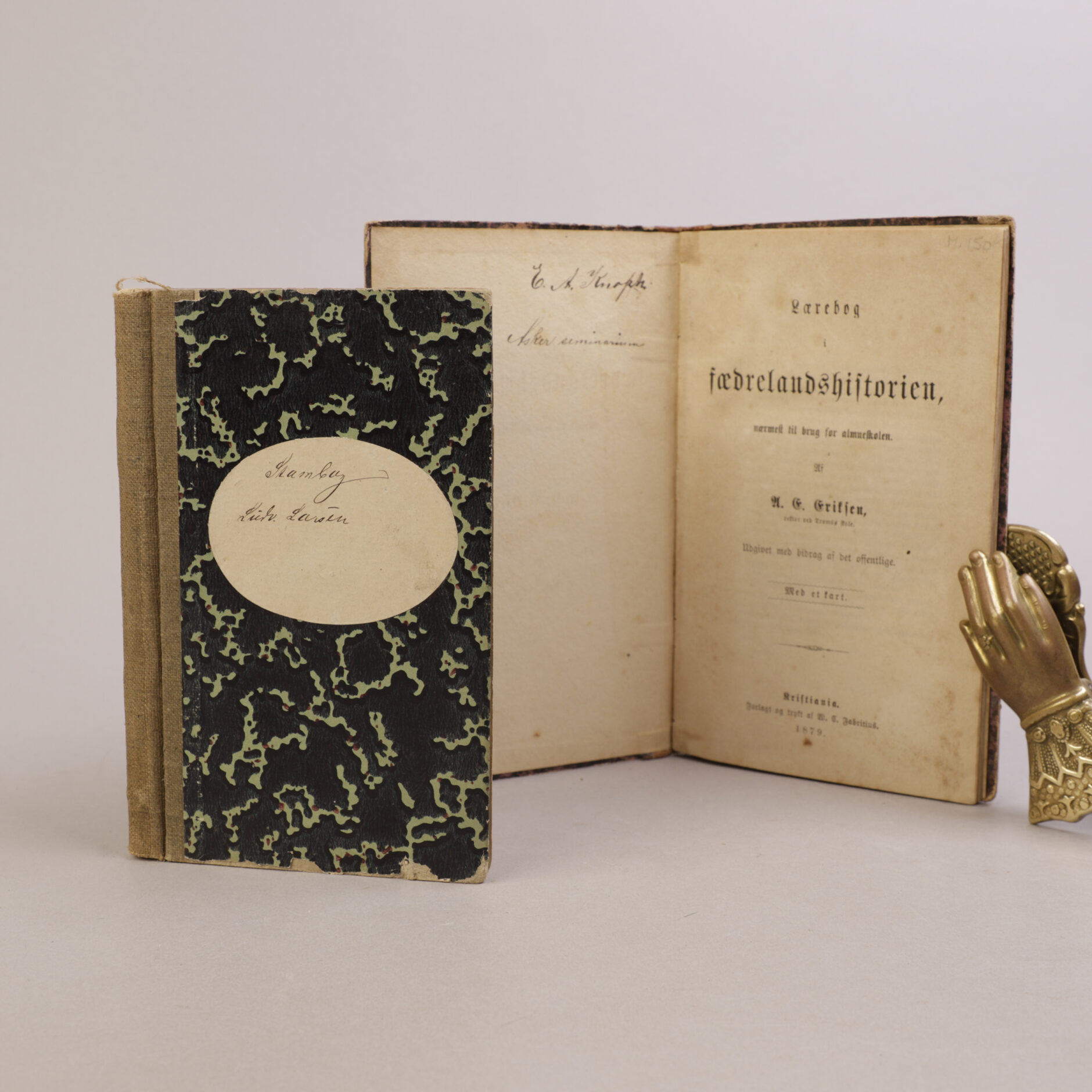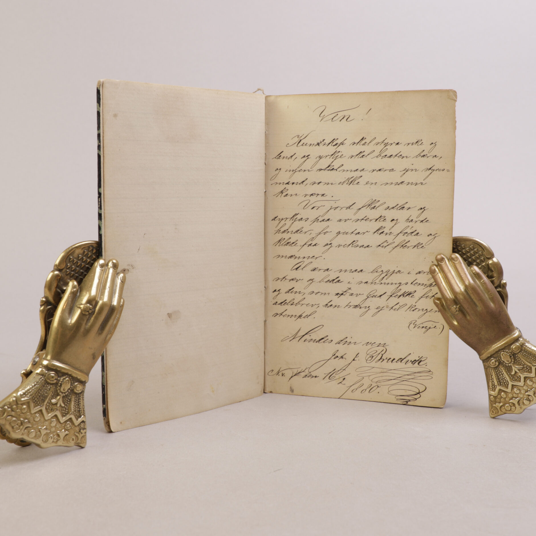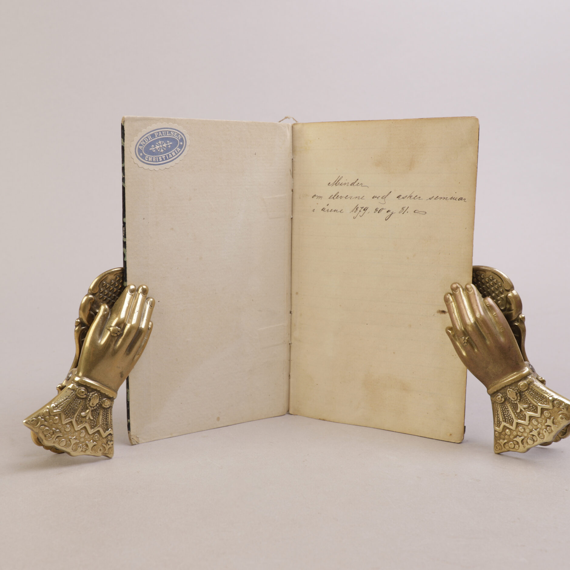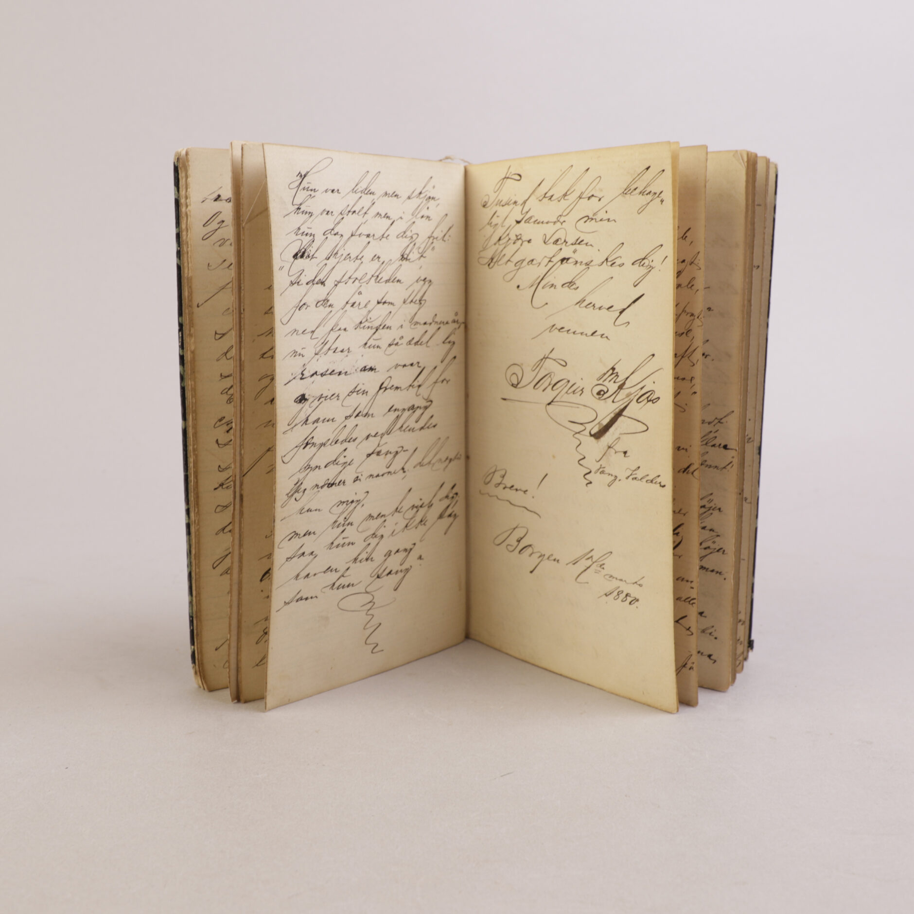 Liten minnebok med håndskrevne hilsner og dikt. Et lite innblikk i unge studenters liv på slutten av 1800-tallet.
