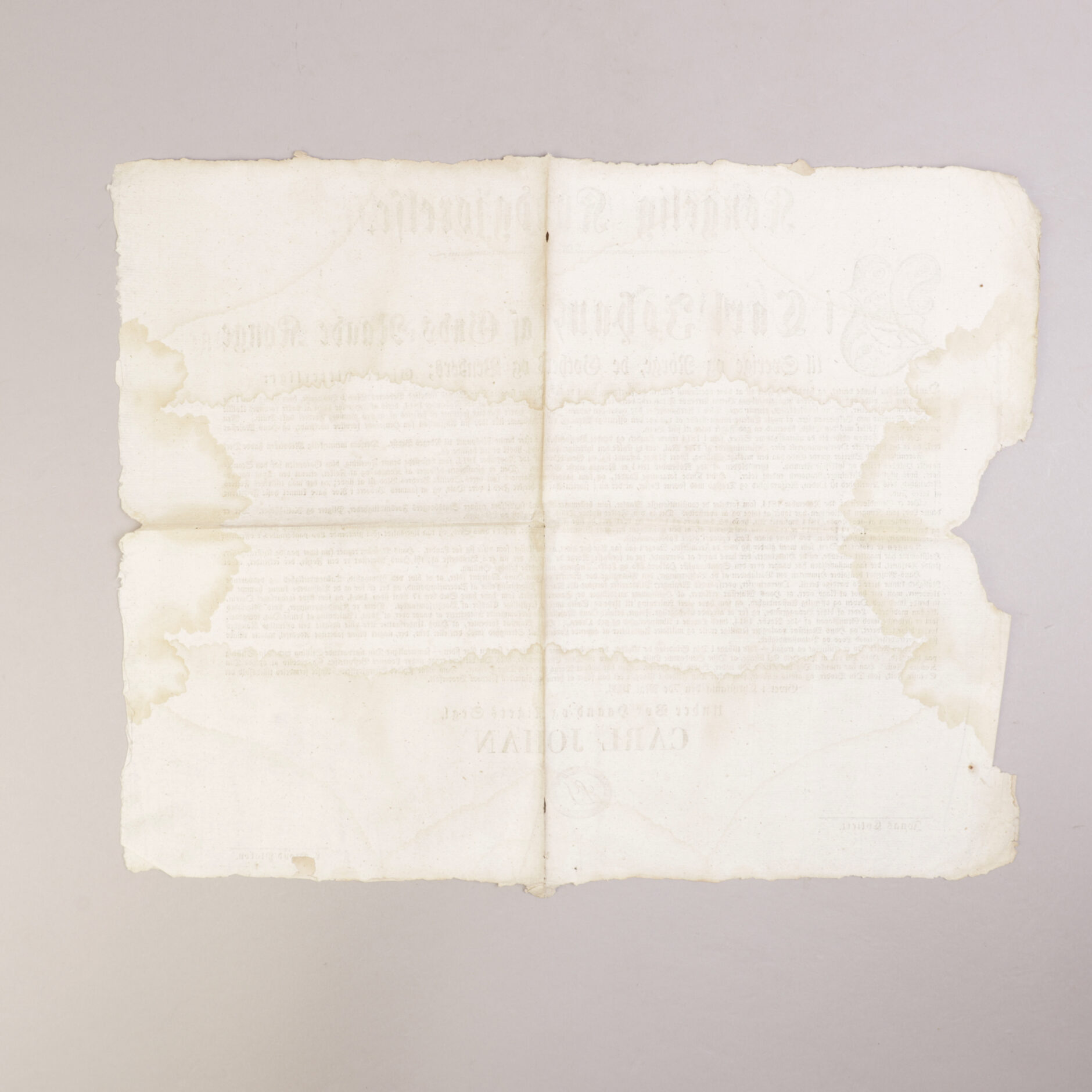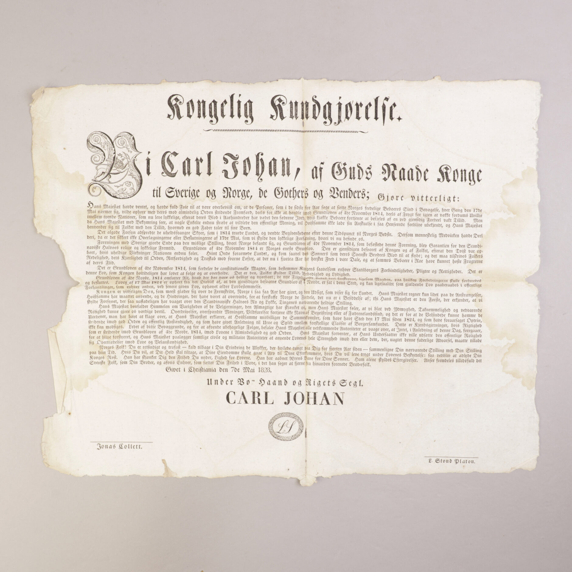 Kongelig Kundgjørelse. Vi Carl Johan, af Guds Naade Konge til Sverige og Norge, de Gothers og Venders: Gjøres vitterligt: Hans Majestæt have ventet, og havde fuld Føie til at være overbeviist om, at de Personer, som i de sidste fire Aar søge at sætte Norges fredelige Beboeres Sund i Bevegælse, hver gang den 17de Mai nærmer sig, vilde ophøre mod deres […]. Givet i Christiania den 7de Mai 1828. Under Vo[r] haand og Rigets Segl Carl Johan. Jonas Collett & L. Stoud Platou