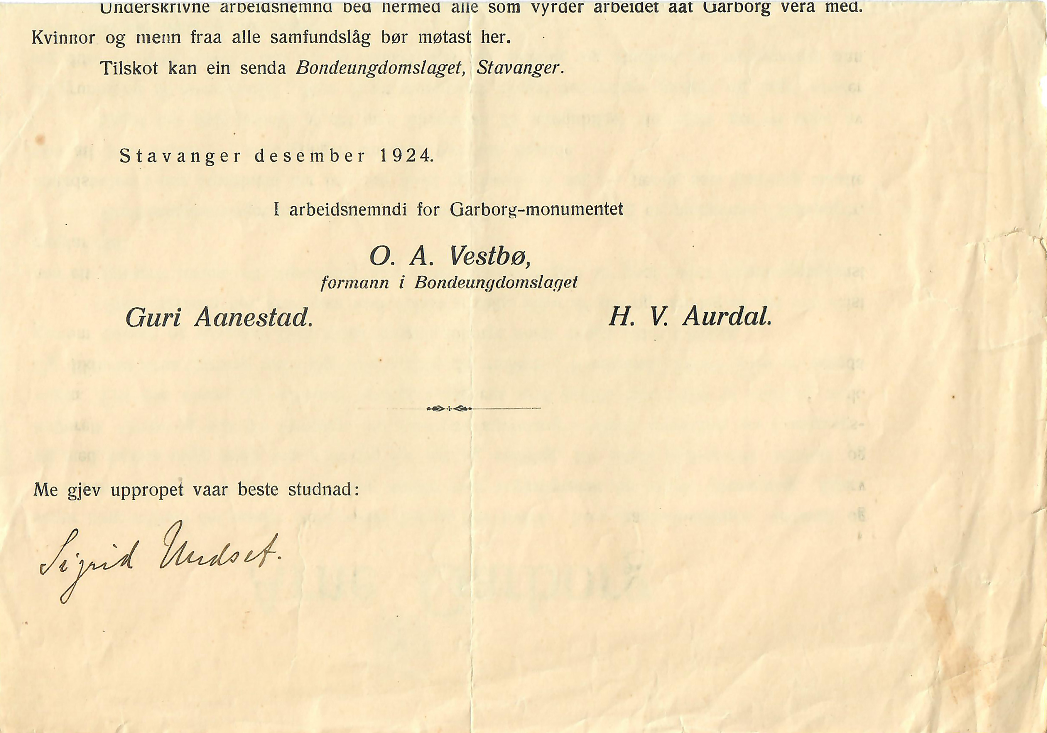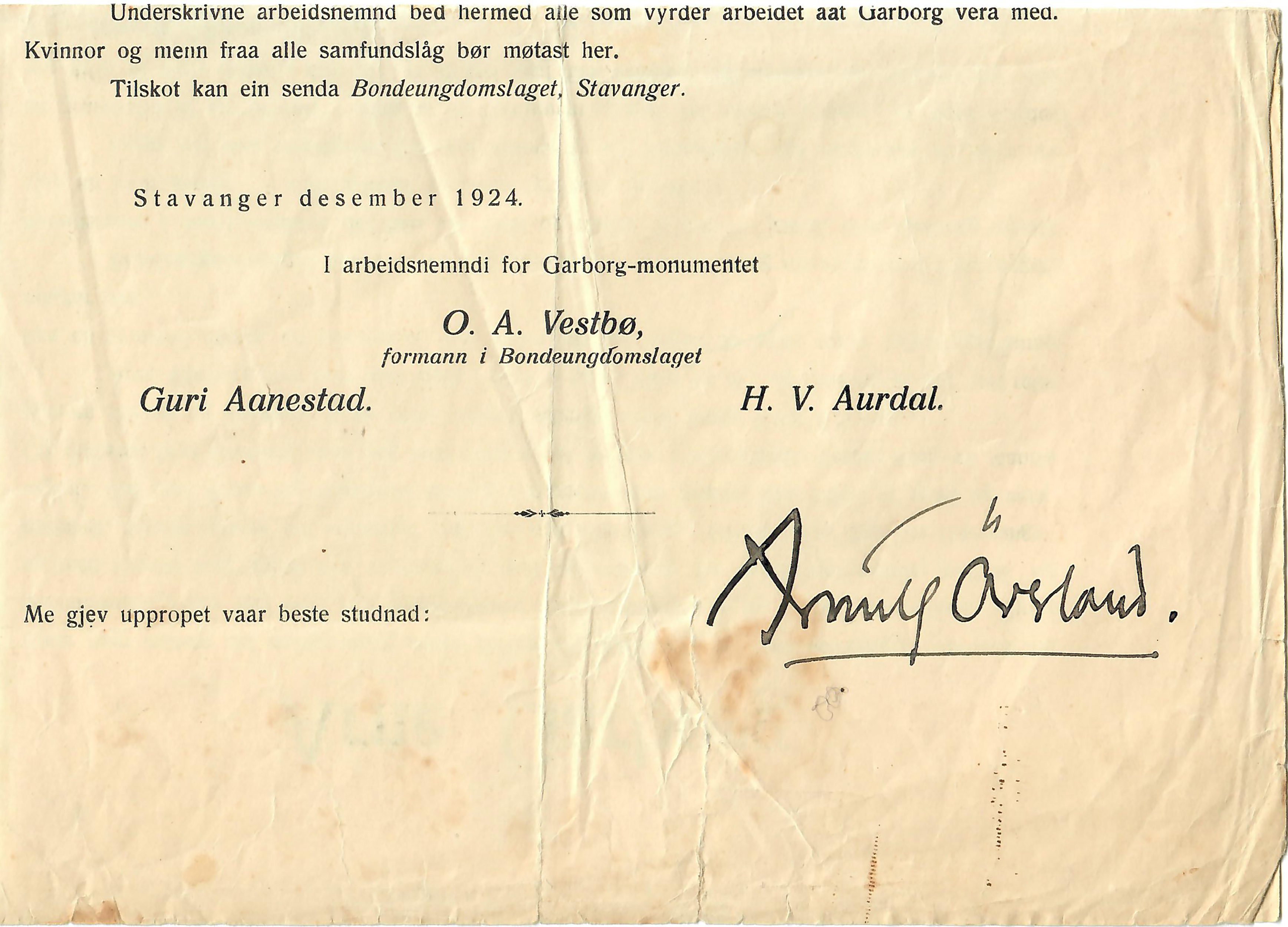 2 opprop for en Garborg-byste SIGNERT av Øverland og Undset