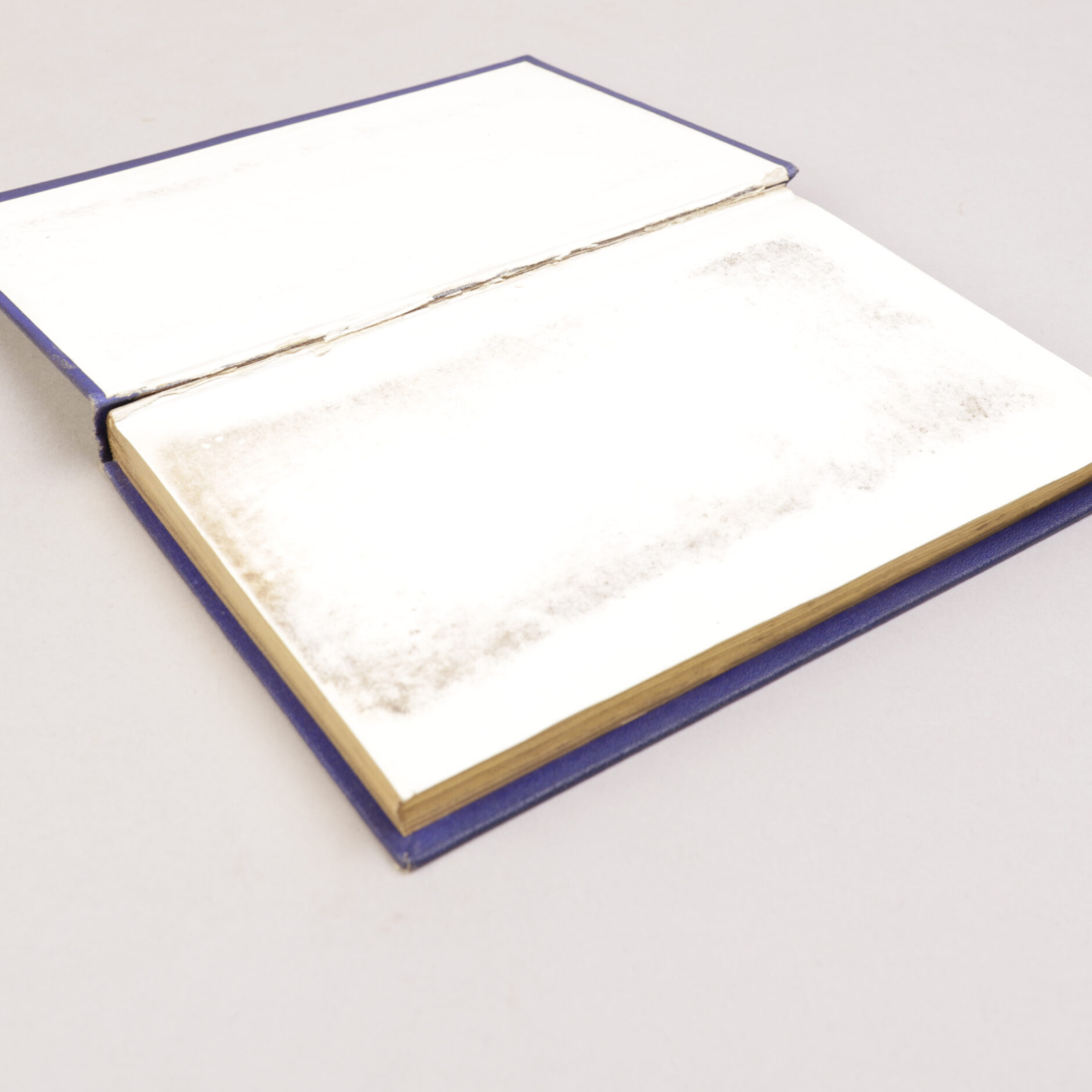 Meget svak slitasje ved øvre kapitél. Særdeles svakt støtte hjørner. Brist i forsatspapiret i indre fremre fals, dog fullstendig fast i bindet. Limet benyttet til det hvite blanke papiret på for- og baksats har smittet av med mørk tone mot forsatspapiret, dette er ikke uvanlig på bind fra denne tiden. For øvrig et meget friskt eksemplar av denne boken som er sjelden i forlagsbind og meget vanskelig å finne velholdt.