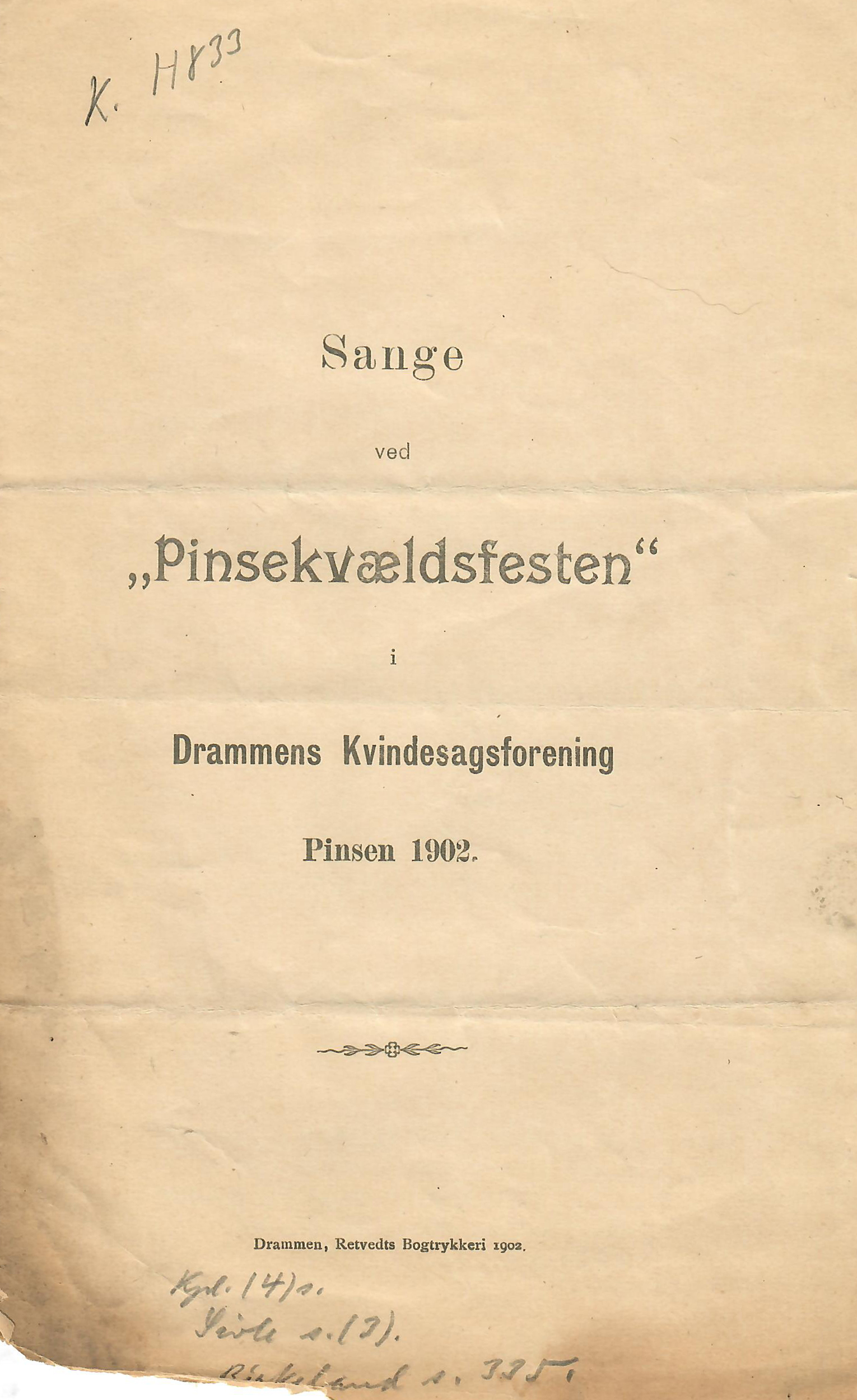 (Sange ved “Pinsekvældsfesten” i Drammens Kvindesagsforening Pinsen 1902.) Drammen. Noe papirtap i nedre kant.
