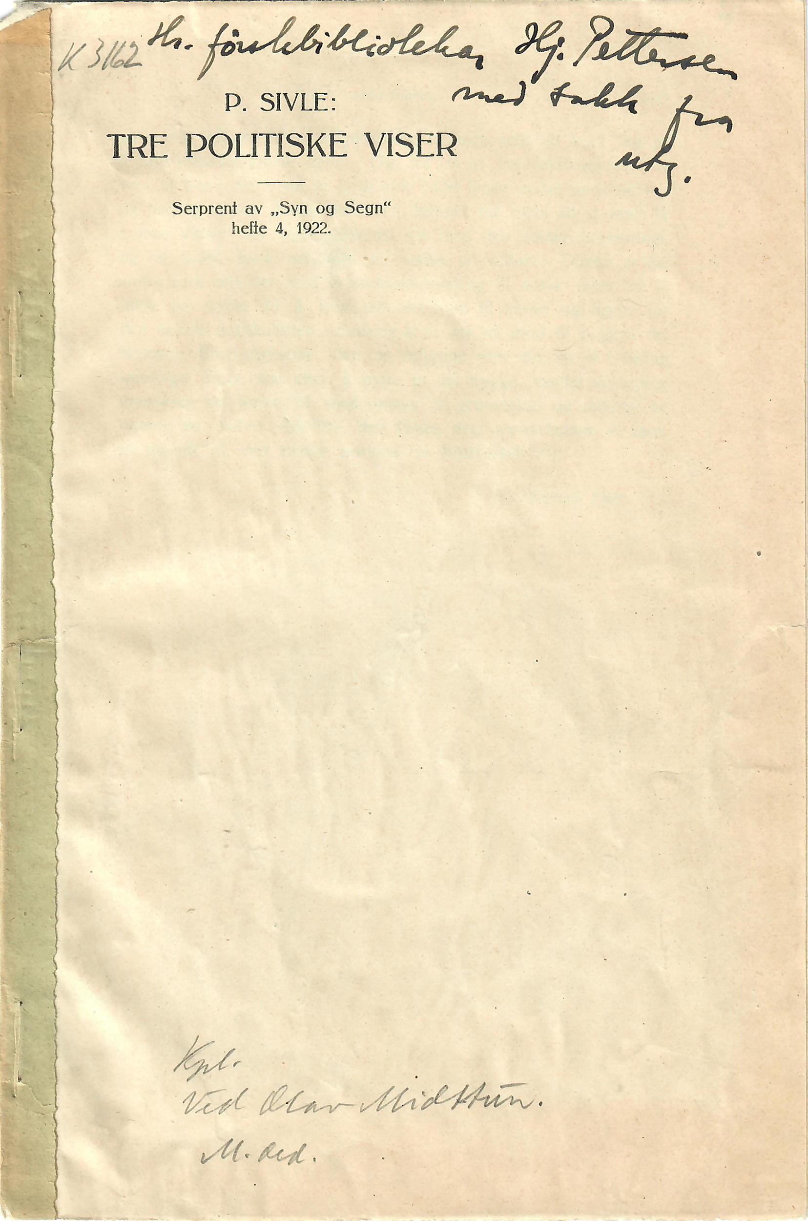 Serprent av ”Syn og Segn”, hefte 4, 1922. DEDIKASJON fra Olav Midttun til Hjalmar Pettersen.