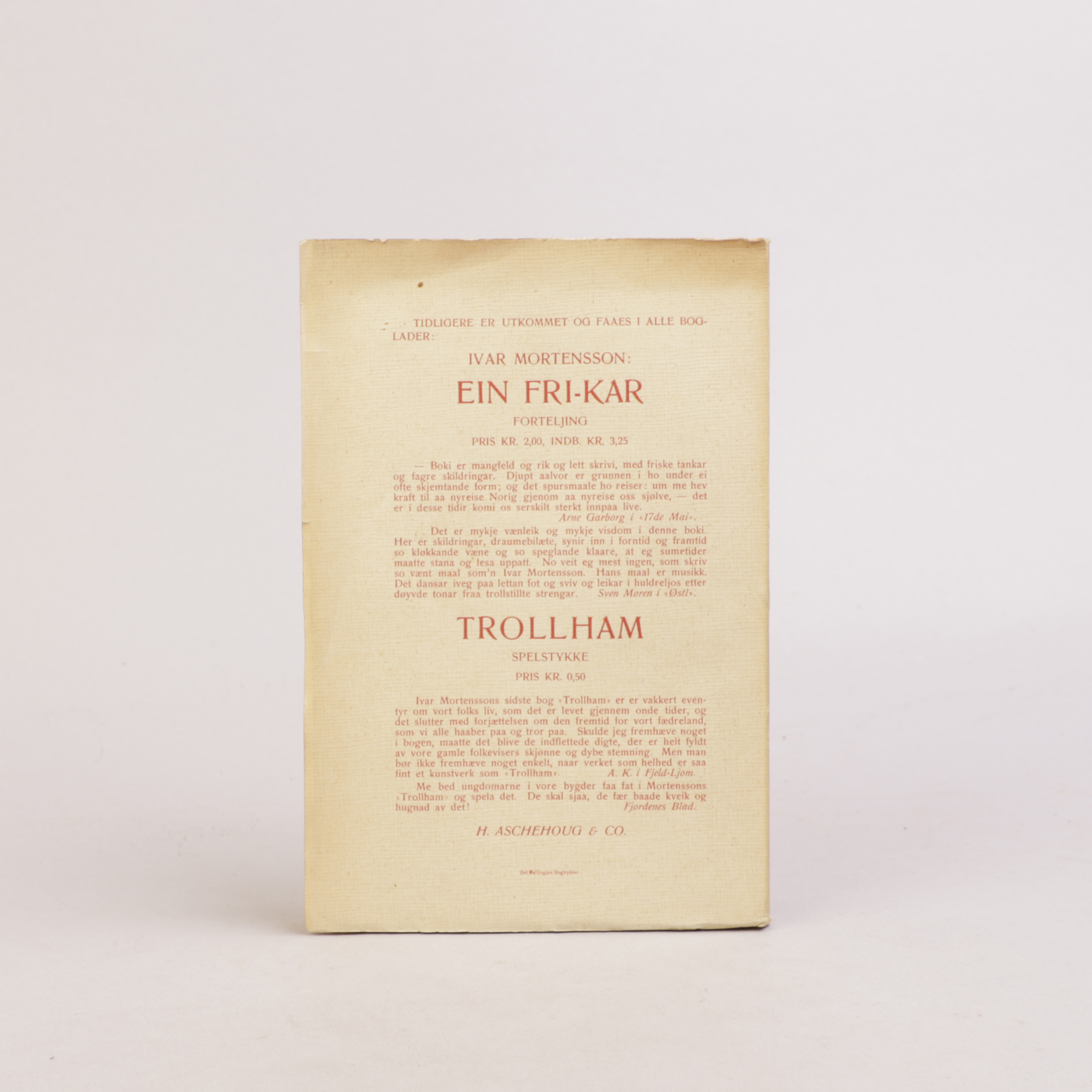 Kristiania: Aschehoug, 1908. Originalt omslag, usprettet.