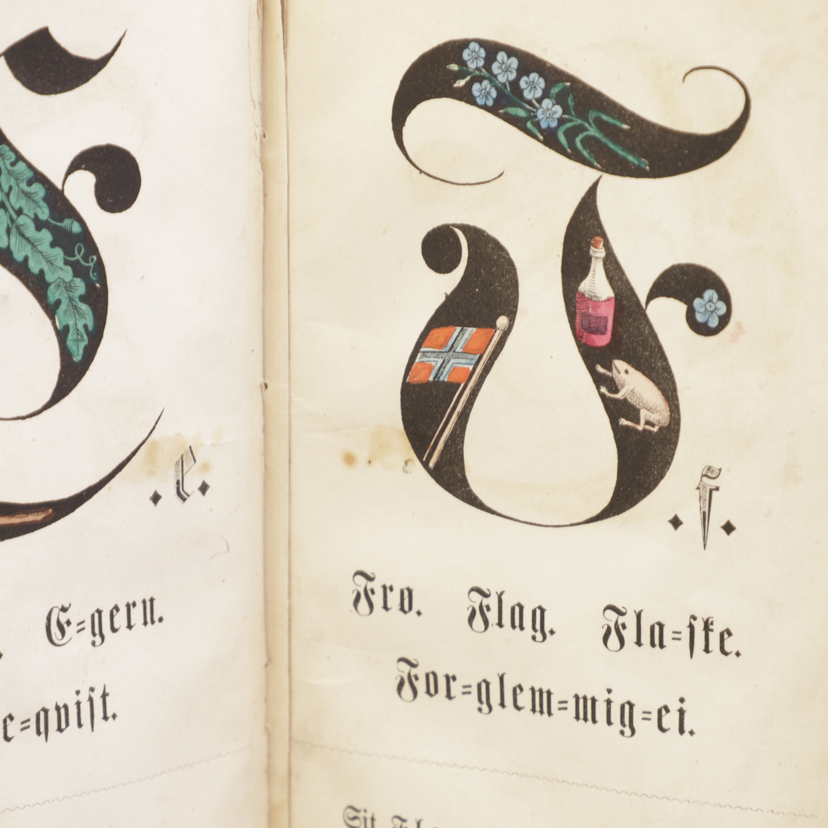 1) Jonas Skougaard, med hans notater på forsats. Han nevner blant annet at det i bokstaven ”F” er tegnet inn et rent norsk flagg.
