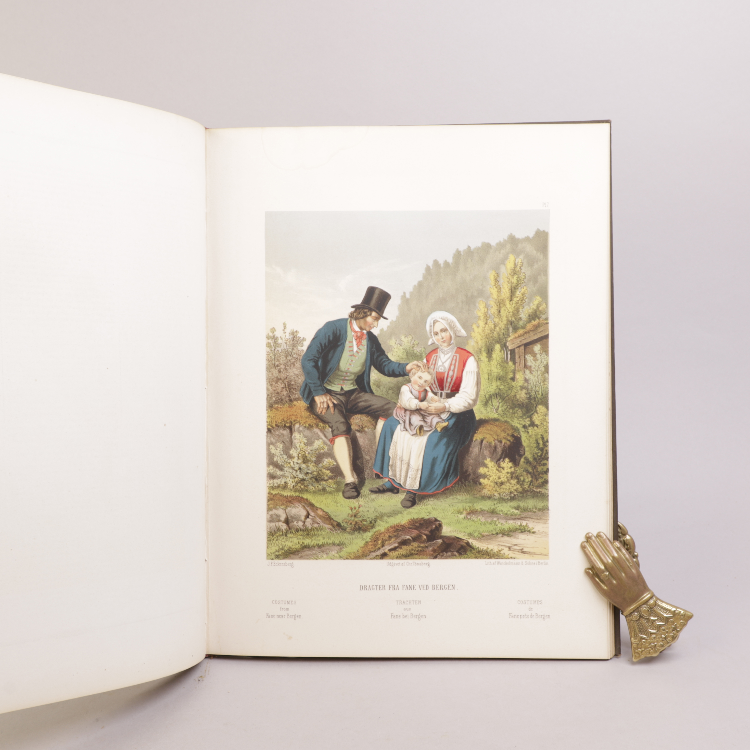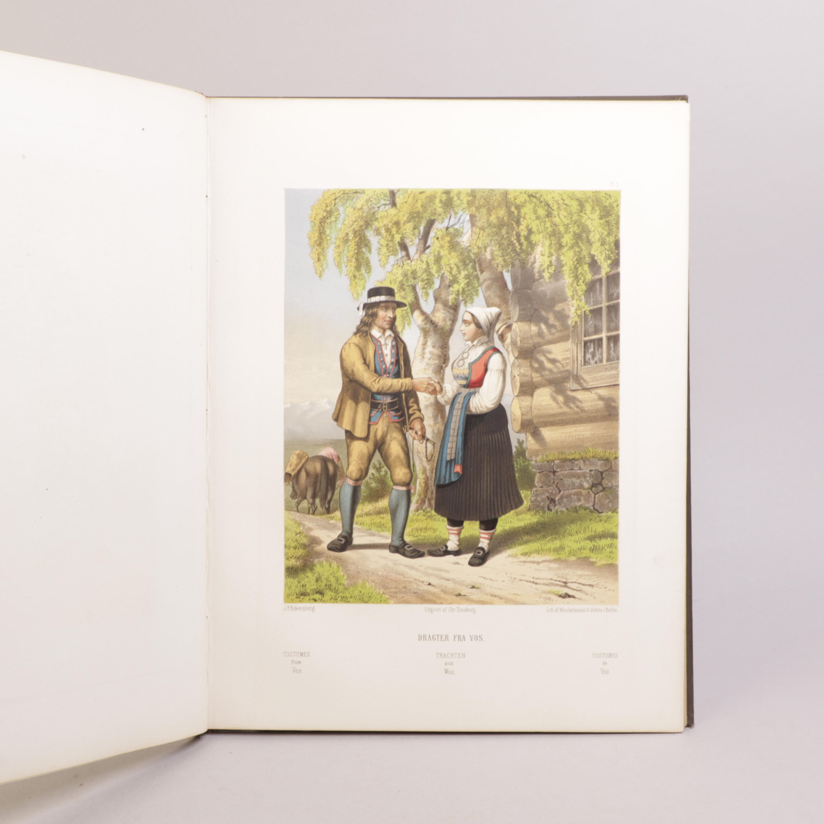 Christiania: Chr. Tønsberg, 1861. 4to. Tittelblad i farger og gull, 15 fargelitografier. Bundet uten notebladene. Samtidig helsjirtingbind, med forgylt tittel på fordekkel.